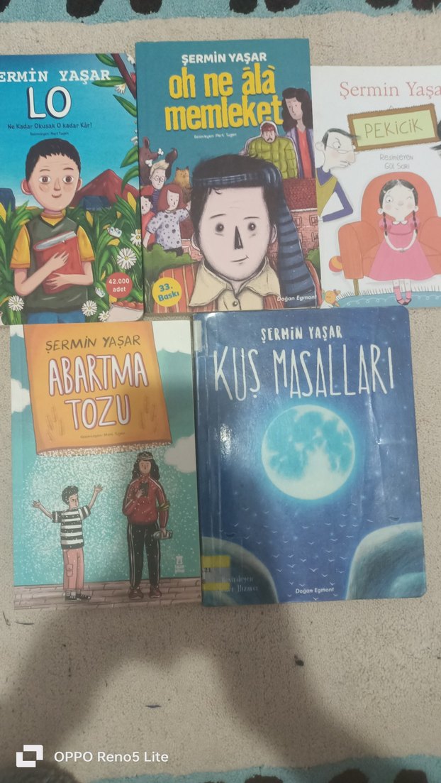 Sermin Yaşar'ın "Abartma Tozu," "Lo," "Pekicik" ve "Kuş Masalları" gibi kitaplarından oluşan çocuk kitapları seti. tanesi 100 tl