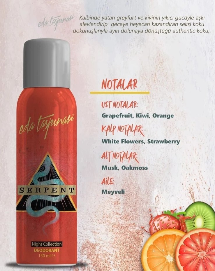 Serpent Night Collection deodorant, greyfurt, kivi ve portakalın üst notaları, beyaz çiçek ve çileğin kalp notaları, misk ve meşe yosununun alt notalarıyla meyveli ve seksi bir koku sunar.