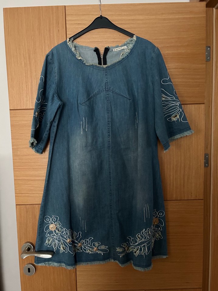 İşleme detaylı kot elbise.Beden 4 yazıyor XL bedene denk geliyor ama ölçüleri de yazıyorum.iki kolaltı arası 54 cm boy omuzdan 90 cm #kadın #elbise #kot