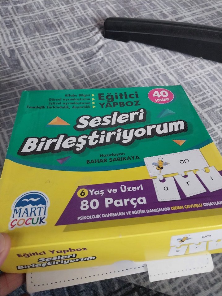 Bahar Sarıkaya tarafından hazırlanan bu eğitici yapboz, 6 yaş ve üzeri çocuklar için 80 parçadan oluşur ve sesleri birleştirmeyi öğretir.