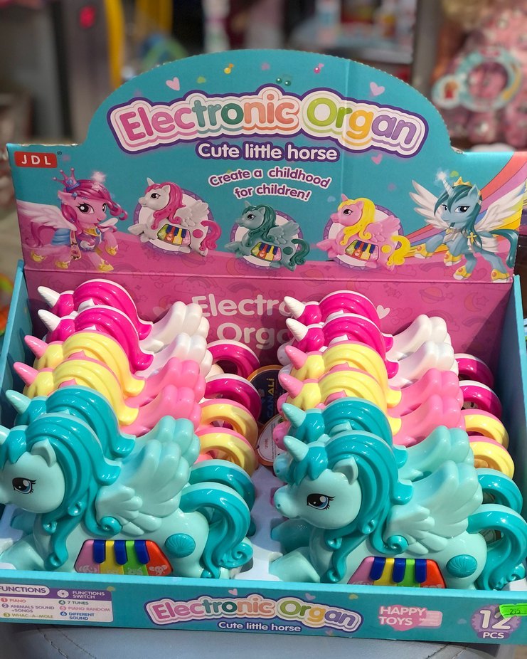 Kanatlı ve piyano tuşlu renkli elektronik küçük at oyuncakları. Çok renkli ve çocuklar için eğlenceli.