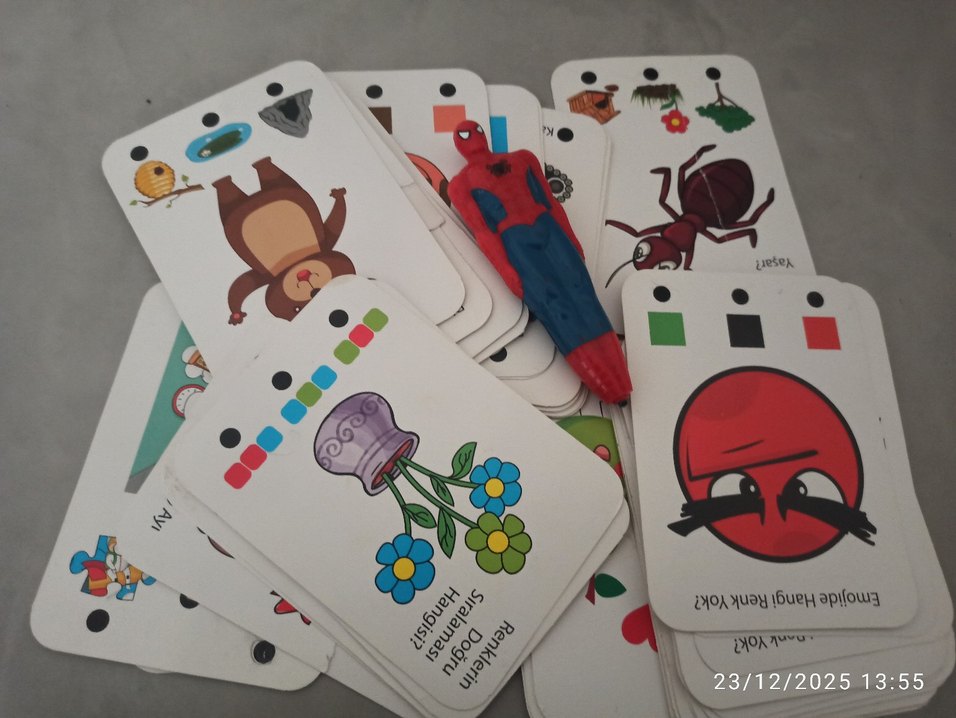 Çeşitli resimlerin yer aldığı renkli eğitim kartları ve örümcek figürlü kalem ile çocukların ilgisini çeker. sesli