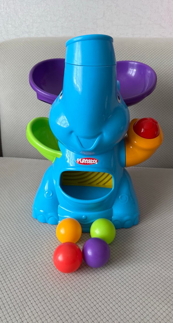 Playskool markalı, çok renkli fil şeklinde eğitici oyuncak, çeşitli renklerde toplar ve etkileşimli parçalar içerir.