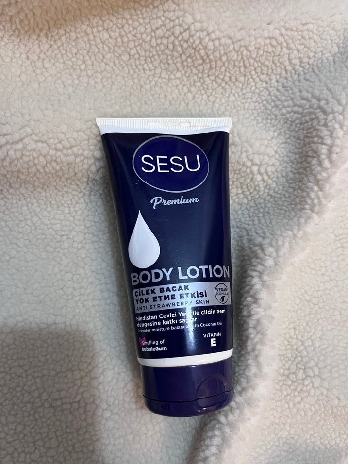 SESU Premium vücut losyonu, çilek bırakma etkisiyle, hindistan cevizi yağı ve E vitamini içeren nemlendirici formülüyle cildi dengeler ve besler.