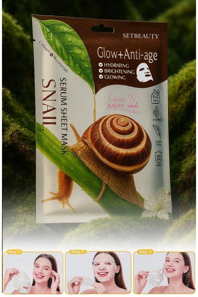 Setbeauty salyangoz özlü serum maske cildi nemlendirir, aydınlatır ve parlaklık kazandırır. Yaşlanma belirtilerine karşı etkilidir.