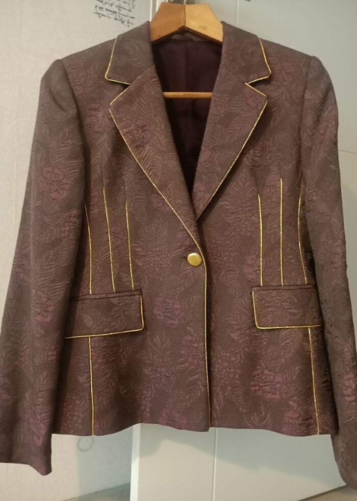 Setre bayan abiye ceket,çok şık ve kaliteli bir cekettir,sadece bir kez giyildi,hiçbir kusuru yoktur tertemizdir,toprak tonları üzerinde mor çiçek desenleri,gold simli şerit detayları ve saten astarı vardır,uzunluk 62 cm.iki kol arası genişlik 48 cm.dir.#setre#ceket#abiye