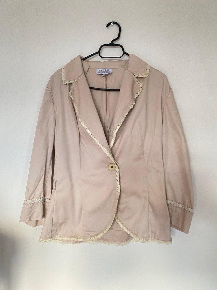 Bej keten kumaştan, uzun kollu, düğmeli klasik kesim ceket. Notlu yaka ve ince dantel detaylarla süslenmiş, midi boy ve normal uzunlukta, ofis ve günlük kullanıma uygun.S beden.