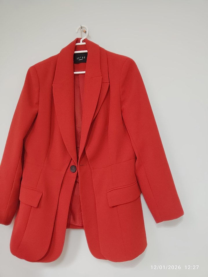 Kırmızı, belden oturtmalı 40 veya 42 bedene uygun düğmeli, normal uzunlukta kadın blazer ceket. Notch yaka, uzun kollu, parlak ve yumuşak dokulu kumaştan. Ofis ve günlük şık tarz için uygun.