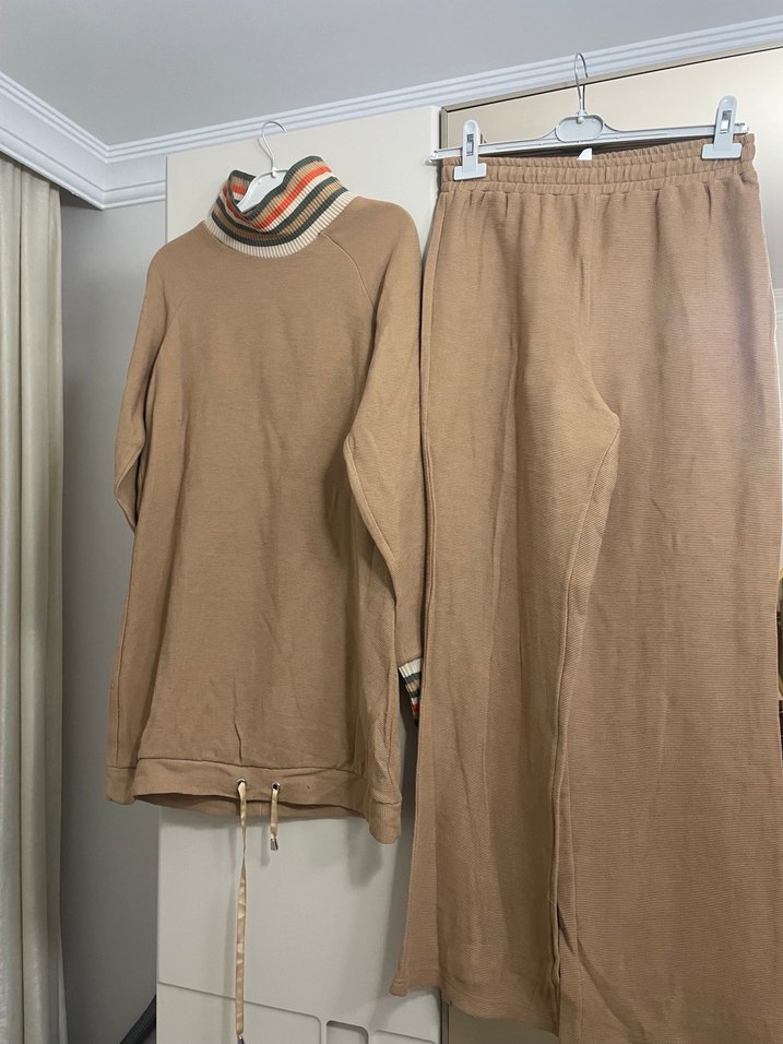 Bej renkte, rahat kesim uzun kollu ve bisiklet yaka kadın takımı. Yumuşak keten kumaştan, günlük rahat şıklık için ideal.