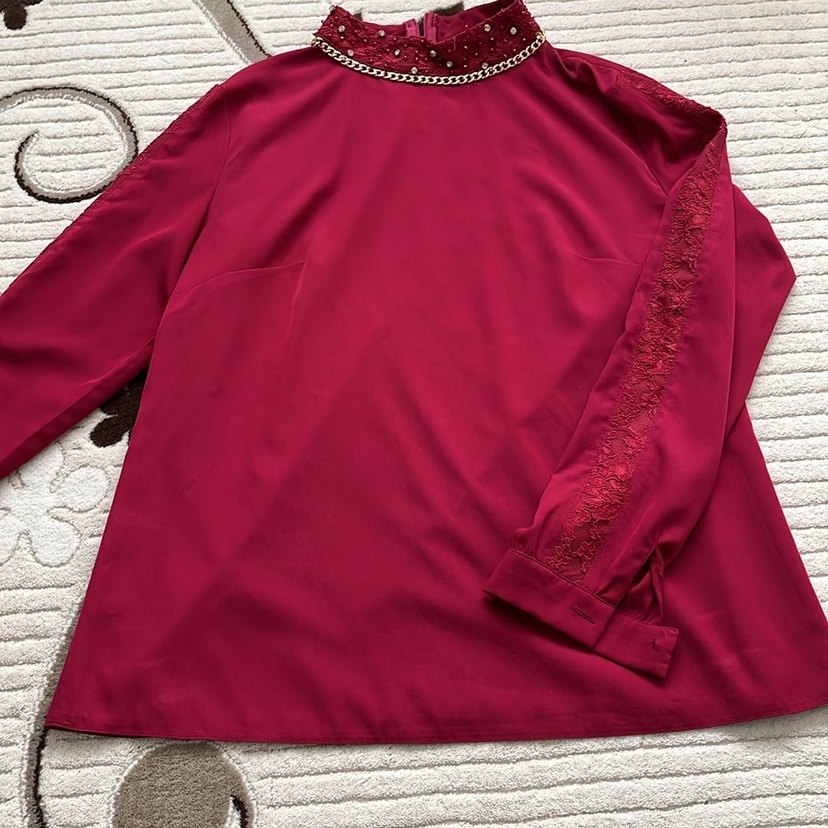 Bordo renk, zincir detaylı yüksek yakalı, nakış işlemeli uzun kollu, bol kesim ve parlak sentetik kumaştan yapılmış kadın bluz.