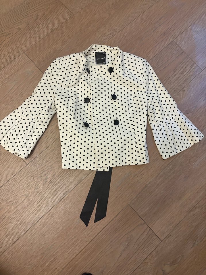 Setrms düğmeli önü, uzun kollu ve kesimli beyaz puantiyeli mini kadın ceket. Yalnızca 1 kez giyildi.