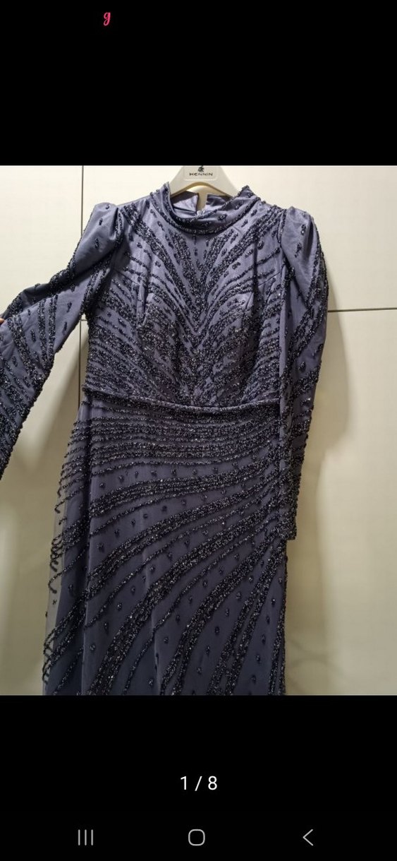 Gri tonlarda, uzun kollu, V yaka ve işlemeli detaylara sahip, drapeli ve vücuda oturan uzun abiye elbise. BIR KERE GIYILDI.