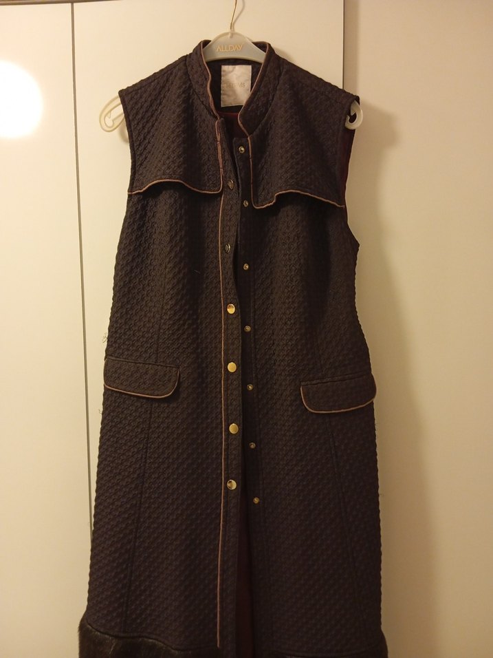 Düğmeli mürdüm renk kadın yelek, kolsuz ve kesik yaka detaylıdır. Uzun boyu ve regular kesimiyle bohem ve Paris tarzı sunar.İki kol arası 55 cm boyu 121 cm