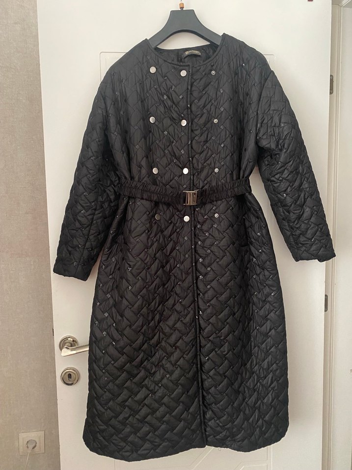 Boy: 120 cm Çok şık kullanışlı bi ürün Hiç bi yerinde sorun yok bedeni dar geldiği için satıştadır.42-44 bedene uyumlu Siyah, düğmeli ve uzun kesim üzerinde pul işlemeli kadın mont, regular fit ve uzun kollu, günlük kullanıma uygun.