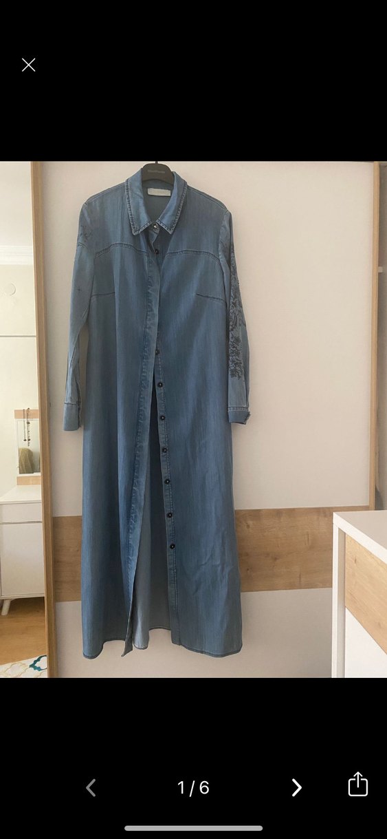 Uzun kollu, düğmeli ve nakışlı detaylara sahip uzun kot tunik bir defa kullandım göğüs 50 cm boy 125 cm
