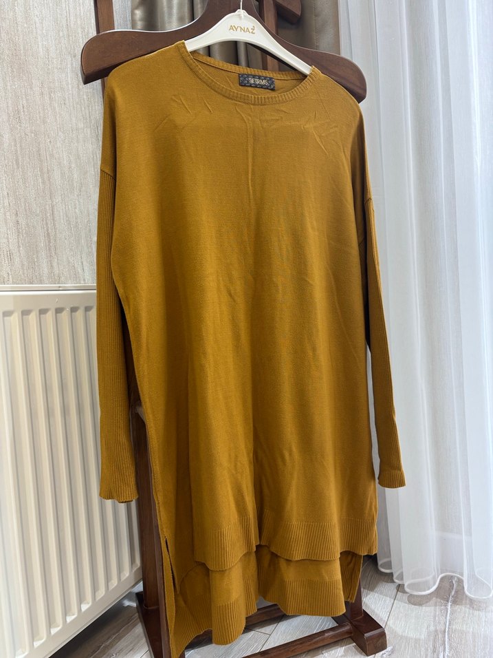 Salaş kesim, uzun boy kahverengi kazak, yuvarlak yaka ve uzun kollu, yumuşak sentetik kumaştan örülmüş. Rahat ve günlük sokak stili için ideal.