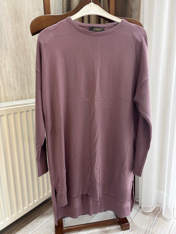 Mor renkli, uzun kollu, yuvarlak yakalı ve bol kesimli triko tunik, yumuşak sentetik kumaştan örülüdür, günlük rahat sokak stili için uygundur.