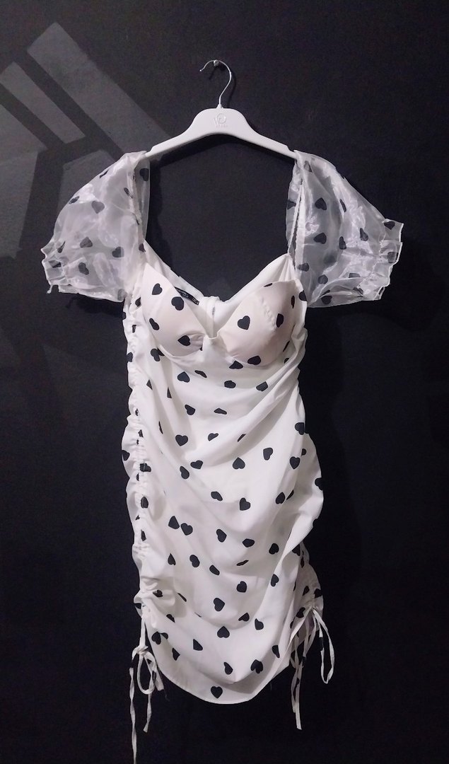 Drapeli beyaz mini elbise, Şeffaf kabarık kollu, düz sentetik kumaştan üretilmiş, cesur sokak stili için uygun.L beden. koltuk 43 cm boy 75 e yakın.