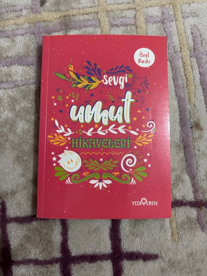 Yediveren yayınevinden 'Sevgi Umut Hikayeleri' adlı, renkli desenlerle süslü kırmızı kapaklı özel baskı kitap.