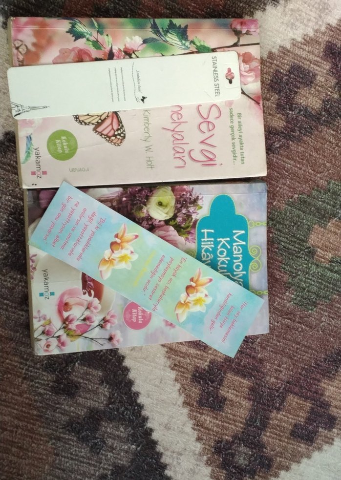 Çiçek desenli kapaklara sahip 'Sevgi' ve 'Manolya Kokusu Hikayesi' adlı iki roman ve üzerinde çiçek görselleri olan ayraçlar yer alıyor.