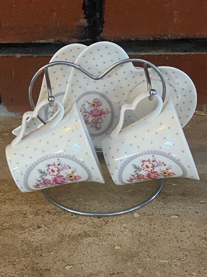 Çiçek desenli, kalp kulplu beyaz porselen 4'lü fincan ve tabak seti, metal stand üzerinde sunulmuştur. ☕️