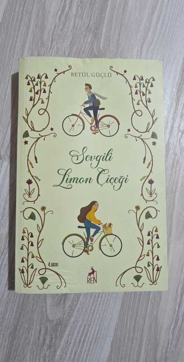 Betül Güçlü'nün Sevgili Limon Çiçeği adlı romanı, bisiklet süren iki kişinin ve çiçek desenlerinin yer aldığı kapak tasarımıyla dikkat çekiyor.