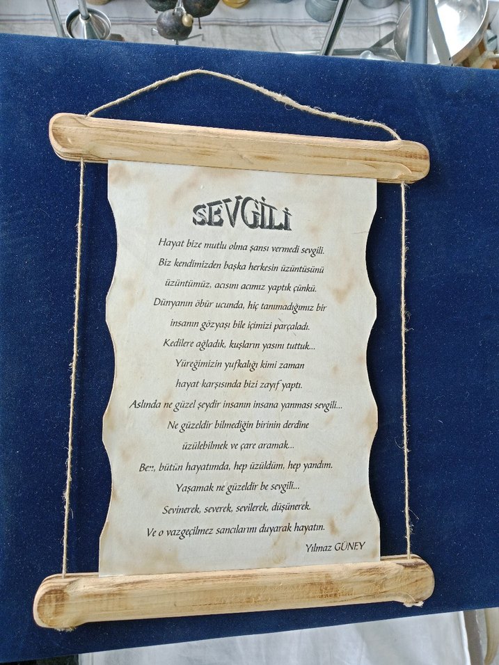 Yılmaz Güney'in 'Sevgili' şiiri, ahşap çerçeveli eski tarz kağıda basılmış, vintage bir görünüm sunuyor.