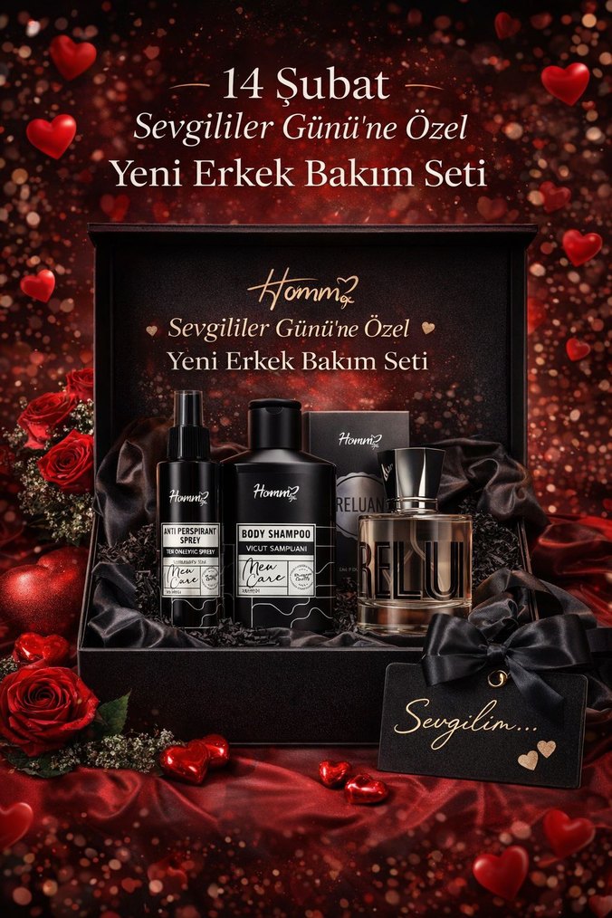 Sevgililer Günü'ne özel, vücut şampuanı, ferahlatıcı sprey ve parfüm içeren erkek bakım seti. Şık kutuda sunulur.