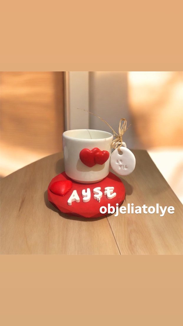 İstenilen renk model yapılır taş tozundan üretilmiştir su bazlı verniklidir Önünde iki kırmızı kalp bulunan beyaz kupa ve 'Ayşe' yazılı kırmızı kalp şeklinde altlık. ☕❤️#sevgililergünüfincan