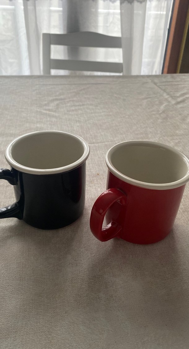 Siyah ve kırmızı renkte porselen kupa, sağlam kulplu ve pürüzsüz kenarlı, sıcak içecekler için uygundur. ☕ 300ml alır. Hiç kullanılmadı.