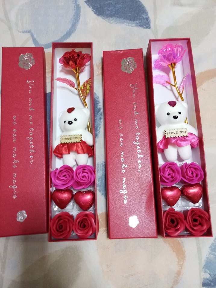 Kutu içinde 'I LOVE YOU' yazılı küçük beyaz ayıcık, pembe ve kırmızı yapay güller, kalp şeklinde çikolatalar ve üstte tek renkli yapay gül bulunur.