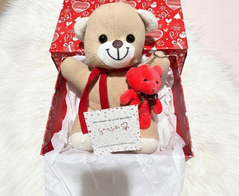 2 adet ayıcık. 1 adet anahtarlık ayıcık ve yanındaki büyük olan sevgililer gününe özel görsellerdeki kırmızı kutuda gönderim yapılır . Piyasa fiyatı 800 tl civarı olan bir üründür . İstediğiniz not eklenir. İstediğiniz tema da eklenir. Ürün içi süslenecektir.
