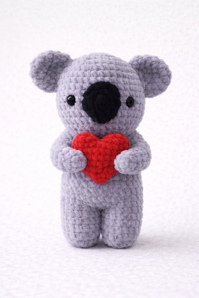 Yumuşak, dokulu kumaştan yapılmış gri amigurumi koala peluş oyuncak, kırmızı kalp tutuyor. Siyah göz ve burun detaylarına sahip.