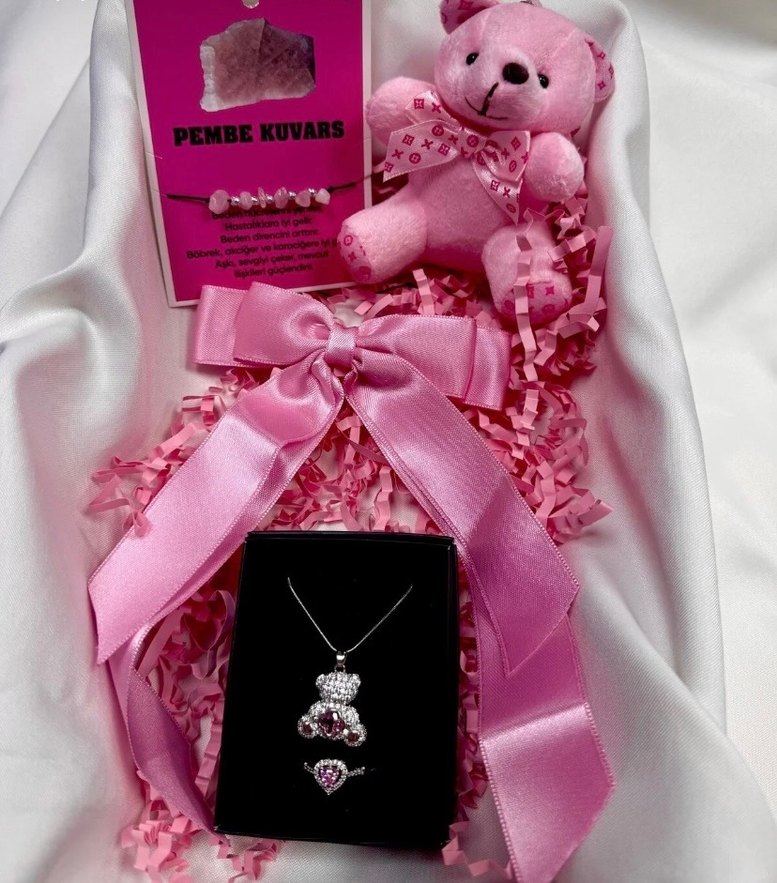 Pembe kalp Çelik ayıcık Kolye ve yüzük, Ayıcık kurdele toka ve doğal taş bileklik