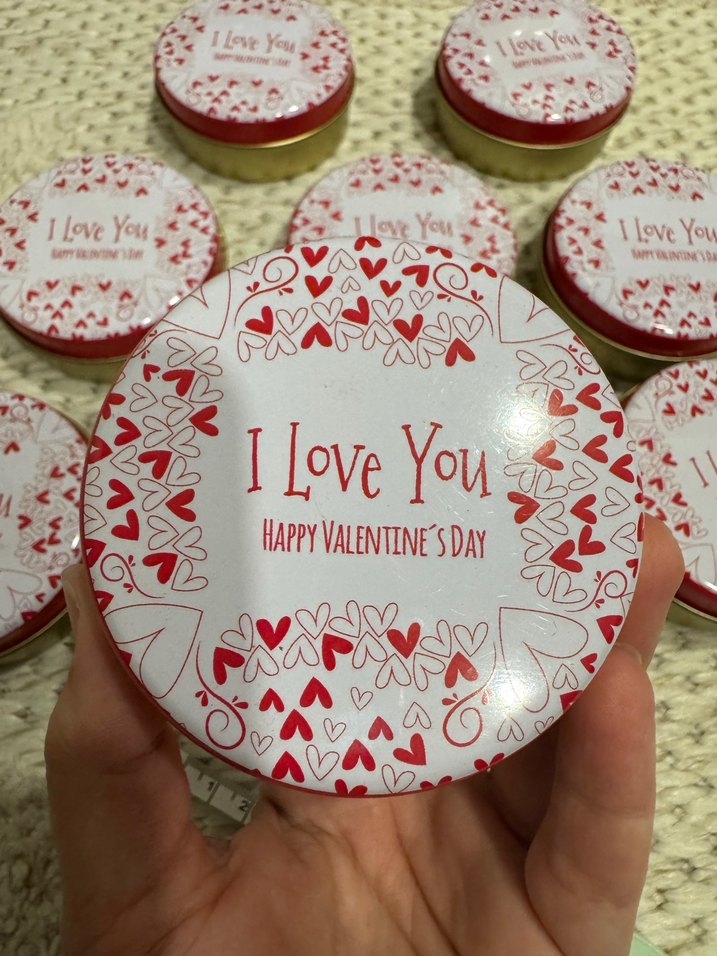 Üzerinde 'I Love You' ve 'Happy Valentine's Day' yazılı, kırmızı ve beyaz kalp desenleriyle süslenmiş teneke kutu. 8 adet fiyatidir.