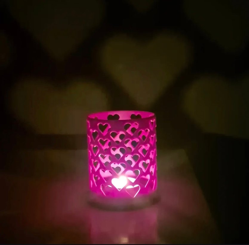 Kalp desenli kesimlere sahip kırmız mumluk, yandığında renkli kalp desenleri yansıtır. Sıcak bir atmosfer yaratır. ️