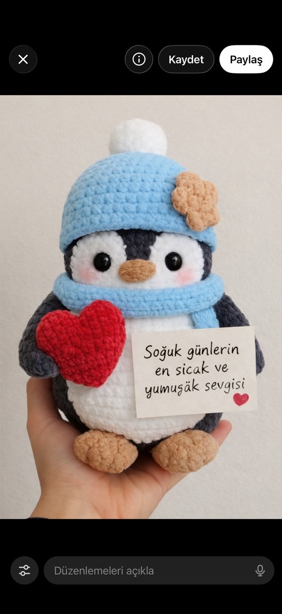 Mavi bere ve atkı takan pastel gri peluş penguen, kırmızı kalp ve "Soğuk günlerin en sıcak ve yumuşak sevgisi" yazılı not tutuyor.