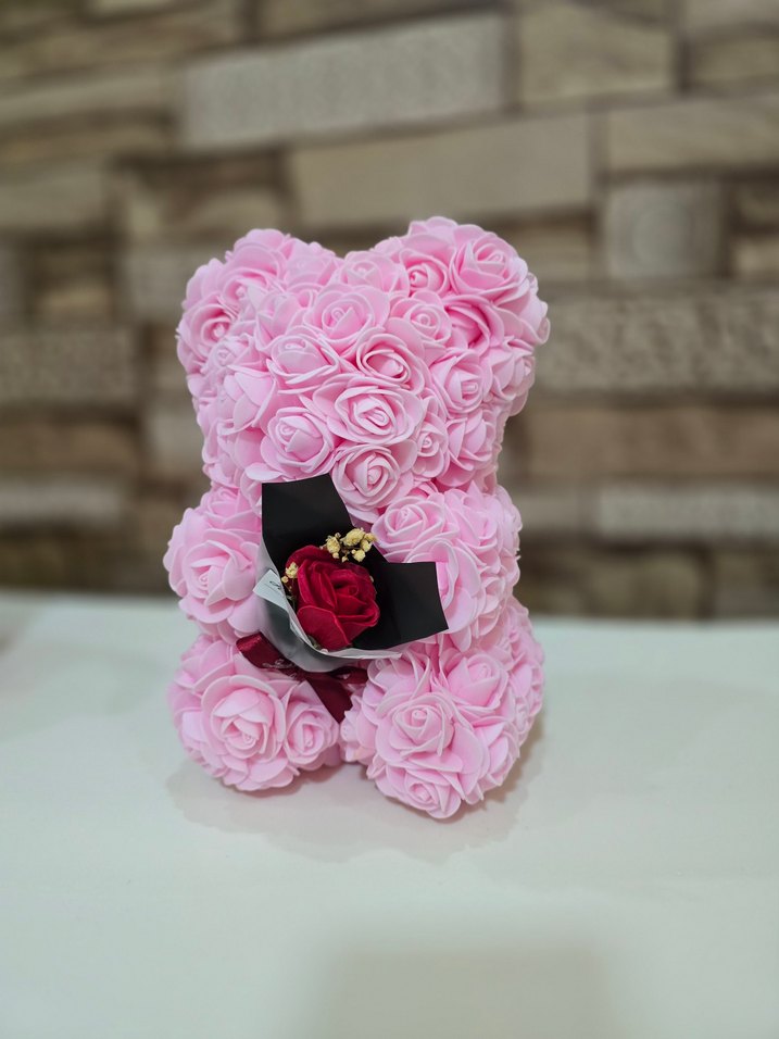 Tamamı yumuşak gülden oluşan pembe peluş ayıcık, küçük bir kırmızı gül buketi tutuyor. Sevdiğiniz kişi bu hediyeye hayran kalacak❤️