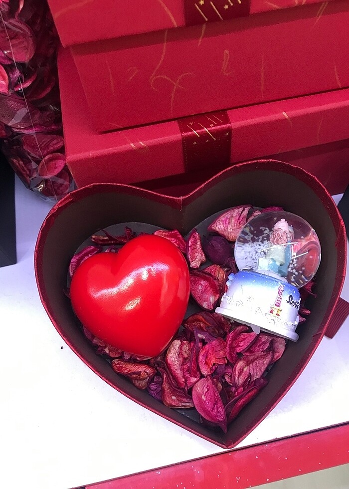Küçük kalpli kutu içerisinde minik kar küresi,ışıklı kalp ve kuru Gül yaprakları ile beraberdir