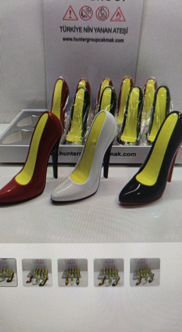 Kırmızı, beyaz ve siyah renklerde, topuklu ayakkabı şeklinde kadın ayakkabı figürlü çakmak . İç kısmı parlak sarı renkte ve şık tasarımlı.