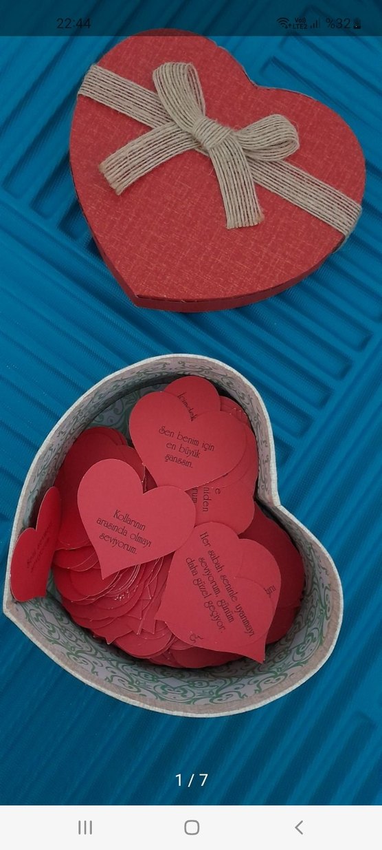 Kırmızı kalp şeklinde not kartları, kalp kutu içinde saklanıyor. Mesajlar veya hatırlatmalar için uygun. 100 aşk sözü ❤️