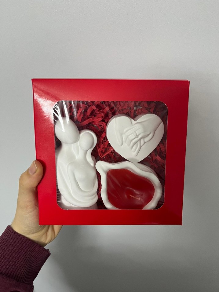 sevgiliye hediye edilebilecek taş figür ve mum seti. kutunun 4 rengi vardır. kırmızı - mavi- siyah - beyaz. mum renkleri diğer görsellerde mevcuttur.