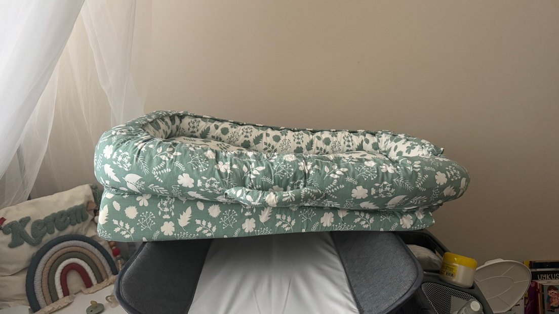 Çiçek desenli yeşil reflü yatağı, bebeklere konforlu ve güvenli bir dinlenme alanı sunar.