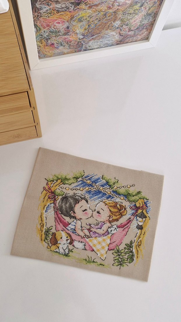 Doğada küçük bir köpekle çevrili hamakta sevimli aşık çiftin nakış deseni .