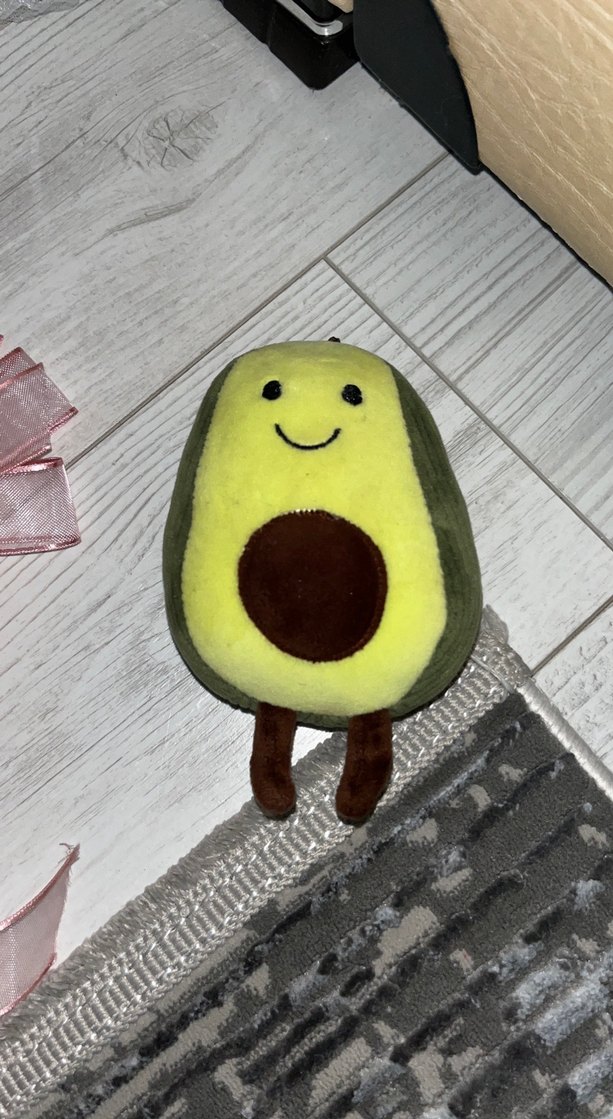 Pastel renklerde, gülümseyen avokado şeklinde yumuşak peluş oyuncak. Sarı ve kahverengi detaylara sahip.