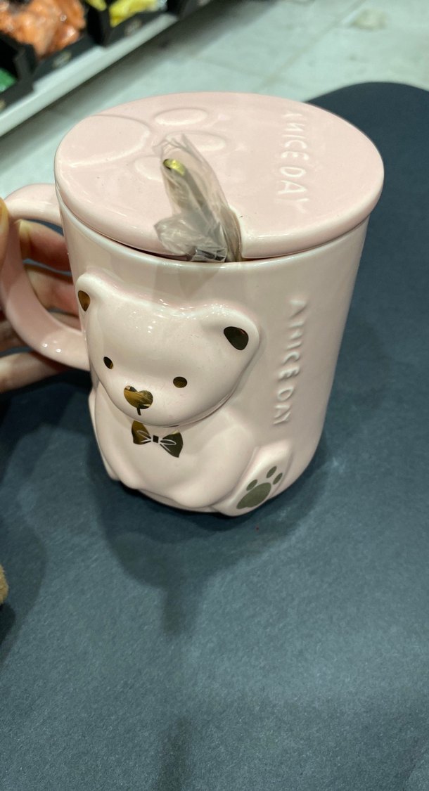 Pastel pembe porselen kupanın yanında sevimli ayıcık figürü bulunur. Altın detaylı ayıcık, kapak ve kaşık ile birlikte gelir. Kapakta "MICEOA" yazısı yer alır.