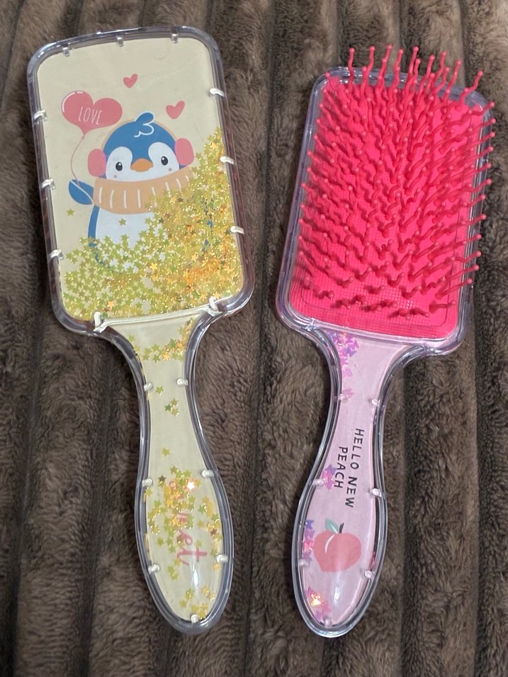 Renkli ve eğlenceli desenlere sahip iki saç fırçası. Biri penguen ve kalplerle, diğeri şeftali desenli. Yumuşak kıllı ve şeffaf saplı.