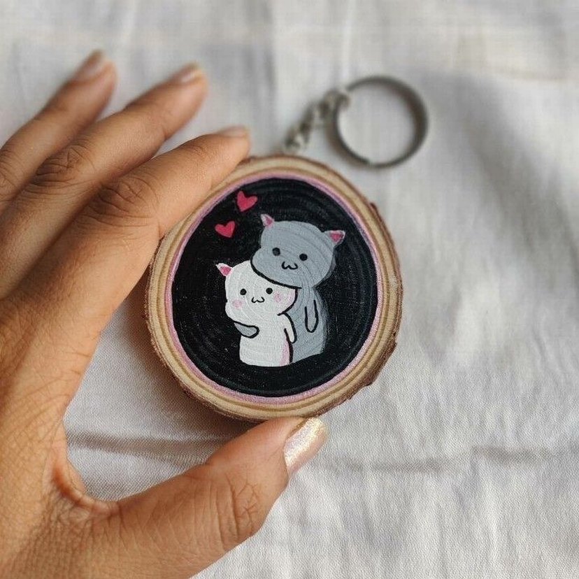 Pastel tonlarda, doğal ahşap taban üzerine sevimli gri ve beyaz kedilerin sarıldığı çizim bulunan anahtarlık. kişiye özel hediyeler kişiye özel çizimler mevcut iletişime geçiniz lütfen