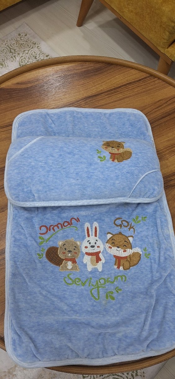 Yumuşak mavi çocuk alt açma bezi renkli hayvan desenleri ve 'Sevi, Ormani' nakışlı, rahatlık sağlar.