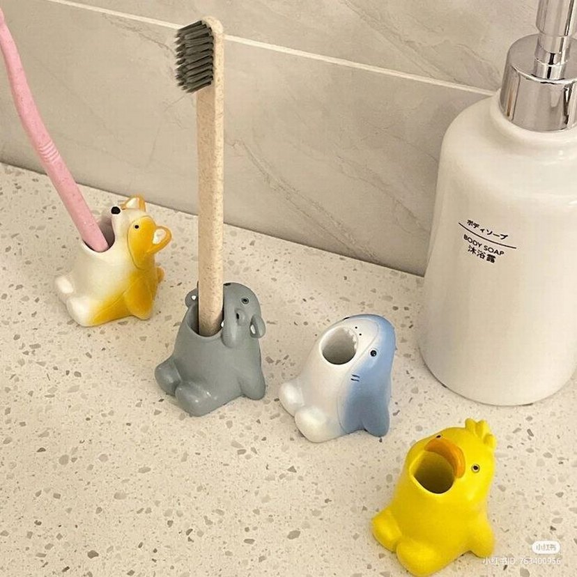 Yumuşak renklerde sevimli hayvan figürlü diş fırçası tutucuları, diş fırçalarını dik ve düzenli tutar.